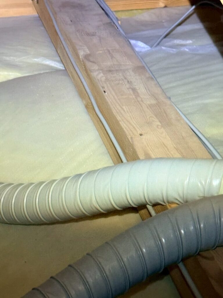 まず外部からネズミが侵入できる穴がないかを一通り確認しました。外壁、屋根まわり、通気口、基礎の取り合い部分など、ネズミが通れる2〜3cm以上のすき間がないかくまなく見て回りましたが、侵入できるような箇所はどこにも見当たりませんでした。「やはりネズミではないかもしれない」という確信が強まったところで、天井裏へ上がって実際に糞を確認しました。