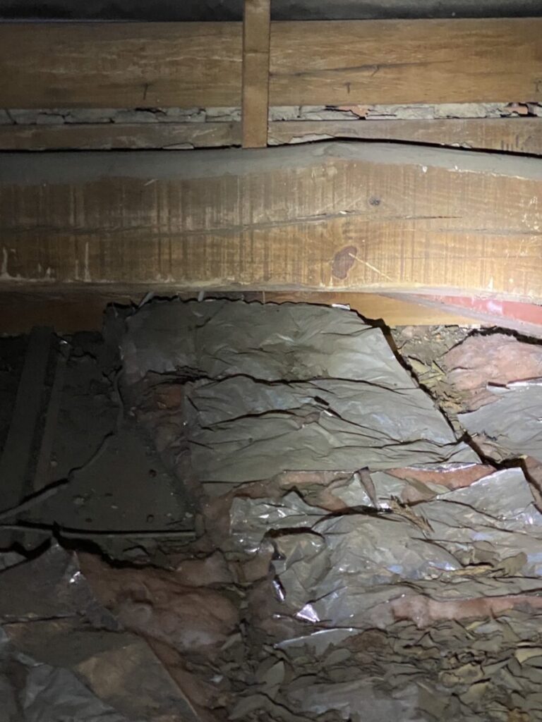 ライトを当てると、断熱材がぐちゃぐちゃにめくれ上がり、